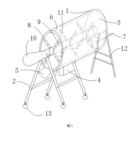 二、通過(guò)電機(jī)帶動(dòng)攪拌架,攪拌架帶動(dòng)滾筒篩旋轉(zhuǎn),使得土壤與攪拌架相碰撞,對(duì)土壤 還起到粉碎的作用 ;