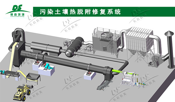 熱脫附修復(fù)是通過直接或間接加熱方式,將土壤中污染組分從固相或液相進(jìn)入氣相的修復(fù)過程。主要用于處理含揮發(fā)性及半揮發(fā)性有機(jī)污染物土壤(如石油烴、農(nóng)藥、多氯聯(lián)苯污染)、汞污染土壤,還用于污染程度高的重金屬污染土壤固化修復(fù)。熱脫附單元的熱源來自燃燒裝置,采用順流式加熱方式。因此需要烘干的物料從進(jìn)料箱、進(jìn)料溜進(jìn)入筒體,隨即被螺旋抄板推向后端。由于烘干機(jī)傾斜放置,物料一方面在重力和回轉(zhuǎn)作用下流向后端,另一方面物料被抄板反復(fù)抄起,帶至上端再不斷地?fù)P撒下來,使物料在筒內(nèi)形成均勻的幕簾,充分與筒內(nèi)的熱氣流進(jìn)行熱交換,由于物料反復(fù)揚(yáng)撒,所含的水分逐漸被烘干,從而達(dá)到烘干的目的。