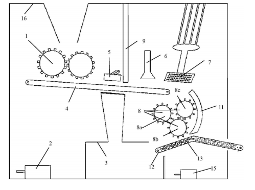在污染土壤的修復(fù)過程中,最要的部分是將挖出的污染土壤進行土壤破碎成小顆粒 狀,并與修復(fù)藥水進行充分的接觸達到修復(fù)的目的。目前,土壤破碎很多并不充分,存在 大量塊狀土壤及碎石,不能達到充分修復(fù)的目的。為了克服現(xiàn)有技術(shù)中存在的不足,本實用新型提供一種用于土壤破碎 及修復(fù)的機械裝置,內(nèi)部設(shè)置了多個破碎裝置、噴霧裝置和篩選裝置,可以有效的對土壤進行破碎和修復(fù),同時剔除大塊碎石,減少對機器的損耗,同時保證更好的已修復(fù)土壤。